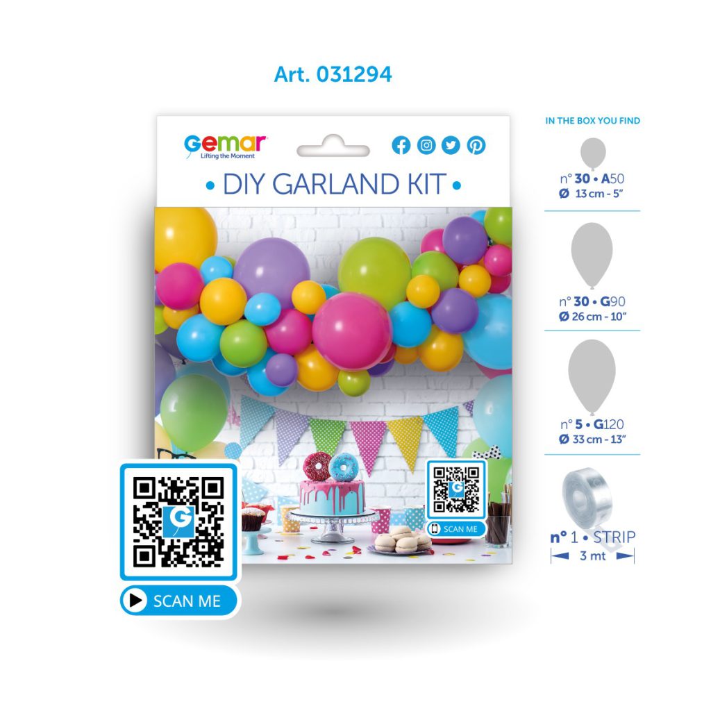 Kada je girlanda sastavljena, okvirna dimenzija iznosi ± 200 cm (duljina) × 50 cm (širina) × 70 cm (visina). Naravno, krajnji izgled i veličina ovise o načinu napuhavanja i rasporedu balona.